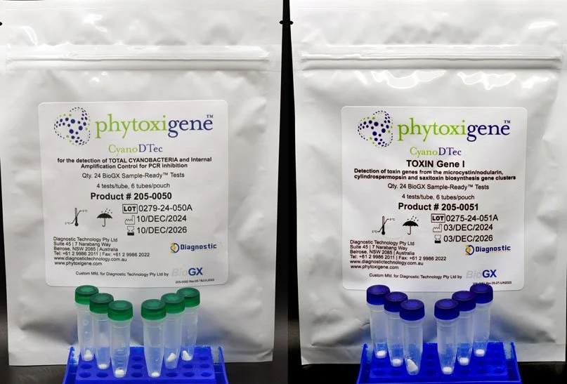 Phytoxigene™ CyanoDTec is a molecular (DNA) based technology (Real Time PCR) that detects and quantifies the presence of Cyanobacteria, blue green algae, and their toxin producing genes in aquatic environments. Not all Cyanobacteria species produce toxins, therefore the presence of an algal bloom does not immediately defer a risk of toxins being present. The Phytoxigene™ test quantitates both the amount of overall Cyanobacteria present in a water sample along with the number of genes that are responsible for the production of the toxins. Toxins associated with blue green algae are either hepatatoxins (cause damage to the liver) and neurotoxins (cause neurological damage). The hepatatoxins include microcystin, nodularin and cylindrospermopsin while saxitoxin, anatoxin and guanitoxin are the primary neurotoxins produced by Cyanobacteria.