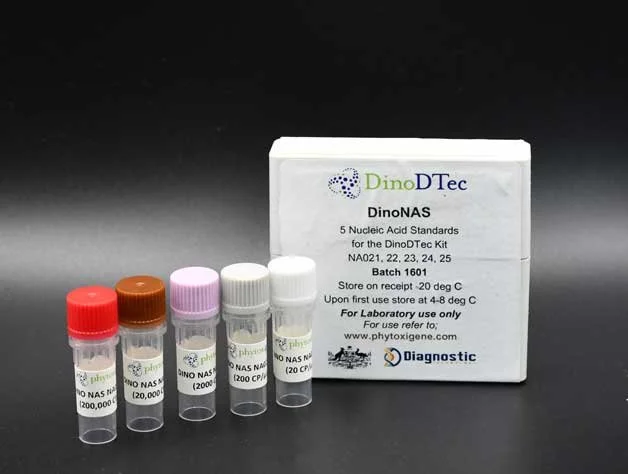 Phytoxigene™ DinoNAS are Nucleic Acid Standards for the DinoDTec kit. The standards are accurate and standardised concentrations of the target genes used in the DinoDTec test. The standards were commissioned and developed by the National Measurement Institute (NMI), a Division of the Australian Department of Industry and a particpant in the International Bureau of Weights and Measures (BIPM) Consultative Committee for Amount of Substance (CCQM). There are 5 standards in each kit 100, 1,000, 10,000, 100,000 and 1,000,000 copies per reaction for the SxtA4 gene of toxin producing dinoflagellates.